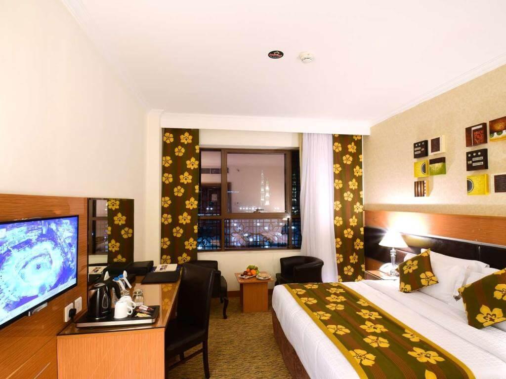 Golden Tulip Al Ansar adalah hotel bintang 4 yang terletak sangat dekat dengan Masjid Nabawi di Madinah, hanya sekitar 2–3 menit jalan kaki. Hotel ini menawarkan kamar ber-AC dengan Wi-Fi gratis, TV layar datar, serta fasilitas restoran dengan menu halal internasional. Cocok untuk jamaah Umroh karena lokasi strategis, pilihan kamar beragam (termasuk untuk keluarga), dan layanan standar seperti resepsionis 24 jam, laundry, serta akses lift. Bandara terdekat adalah Prince Mohammad Bin Abdulaziz International Airport (MED) yang berjarak sekitar 12,7 km (7,9 mil), sementara King Abdulaziz International Airport (JED) di Jeddah berjarak sekitar 314,2 km (195,2 mil). Jarak dihitung dalam garis lurus dan mungkin berbeda dari jarak tempuh sebenarnya, ditampilkan hingga ketelitian 0,1 km atau mil.
